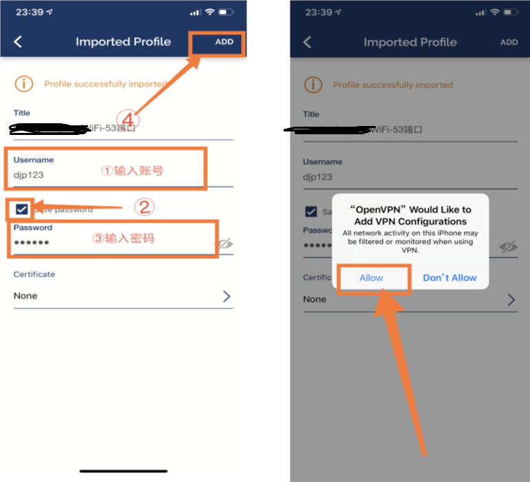 Save password,输入账号(Username)和密码(Password),然后点击右上角 ADD,点击Allow允许安装线路